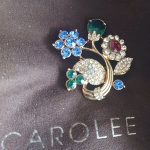 Elegant Carolee brooch featuring a stunning floral design with gold, blue, green, and red accents. Perfect for adding a touch of sophistication to any outfit.
