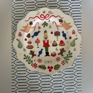 Colorful holiday-themed decorative plate with nutcracker and festive motifs. Features red, green, and blue accents.