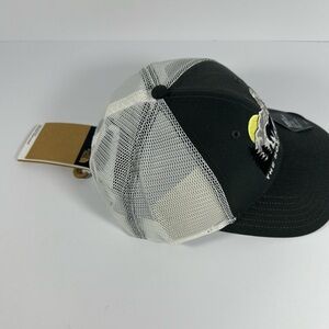 Classic trucker hat by The North Face. Features a gray front with white mesh back. Embroidered mountain and bear design.