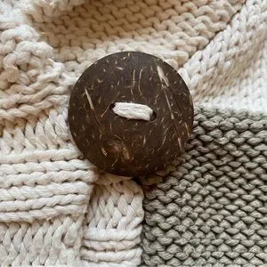 Large decorative wood button closure.