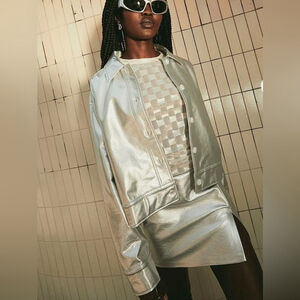 nia venus jacket, metallic silver jacket, faux leather silver coat, trendy silver outerwear, space age jacket, futuristic jacket, y2k metallic, silver moto jacket, party jacket, influencer style, holiday outfit, statement jacket, shiny silver top layer, celeb style jacket
