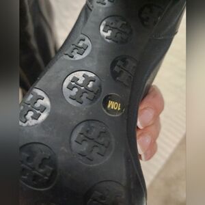 Elegant black leather boots with front zip. Features signature Tory Burch logo charm. Sleek and stylish design.Small scratch see last pic.Hard to see