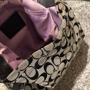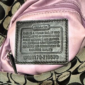 Stylish Coach hobo bag with signature pattern. Black and tan colors. Perfect for everyday use.