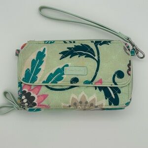 Elegant Vera Bradley wristlet with a floral pattern. Features a mint green base with pink accents. Includes a convenient wrist strap.
