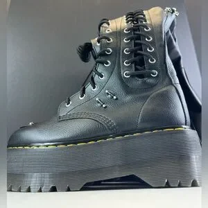 This towering 28-eyelet boot is built from soft Virginia leather and Tumble Stretch PU and covered in unmissable hardware from top to sole. Stacked on Dr. Martens tallest Quad Max sole and fitted with shiny silver eyelets, a toecap plate, and barbell detailing. Fully adjustable front and side lacing for a customized fit and an inside zip for easy on-off wear. The boot is tagged with double black and yellow heel loops, and the sole is secured with their signature yellow welt stitching. The metal toe plate is for fashion, not function