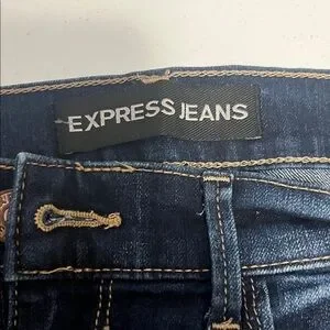 Trendy ripped denim shorts. Dark blue wash with frayed edges.