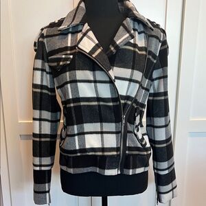 Chic bomber jacket with bold plaid pattern. Features a stylish zipper and comfortable fit.