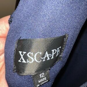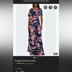 This stunning sundress by Xscape showcases a captivating floral design on a navy blue backdrop, accented with soft pink blooms. Featuring a v-neckline and flutter short sleeves, it offers a graceful silhouette ideal for wedding guest or cocktail events. The flowing maxi length adds an elegant touch to this exquisite dress. WORN ONCE