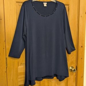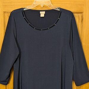 Chicos Shirt Sz 2 LG Top Navy Blue LS Blouse Embellished Casual Evening Party Stretchy Hi Lo