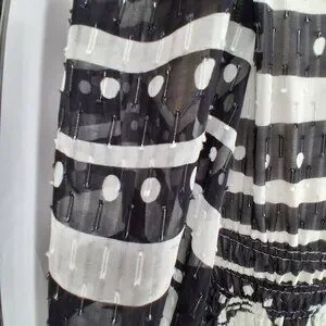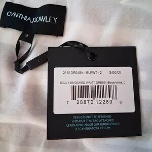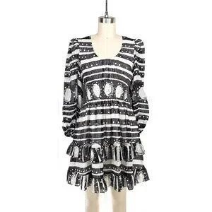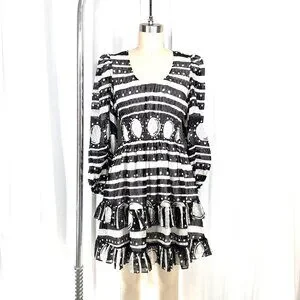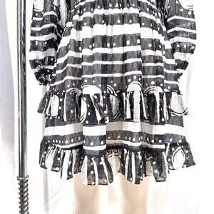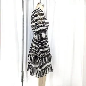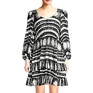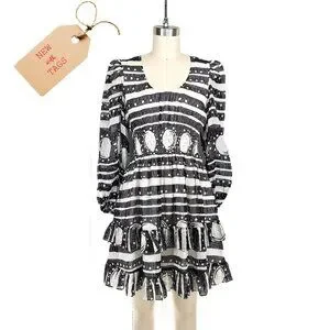 This Cynthia Rowley silk Sicily dress features a black-and-white abstract print, a soft scoop neckline, a smocked waist, and a tiered ruffle hem. Lightweight 100% silk with long sleeves and elastic cuffs.