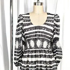 Cynthia Rowley Sicily Silk Wrap Dress Black White Smocked Waist Cap Sleeve Size