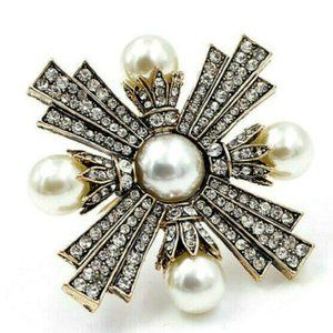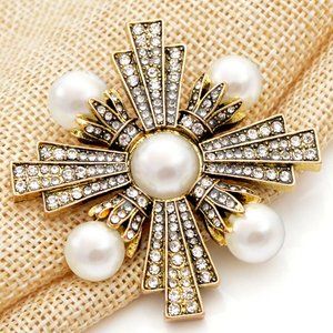 High End Gold PEARL Maltese CROSS Clear Rhinestone Brooch Vintage Inspired Design