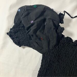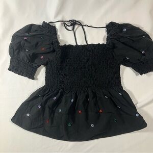 Hill House Jammie Jewel Crystal Stone Embellished Smocked Puff Sleeve Black Short Sleeve Top, womens XS. In excellent condition!