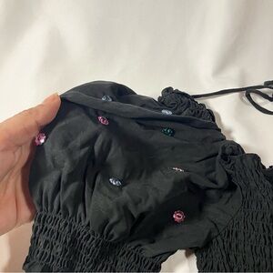 Hill House Jammie Jewel Crystal Stone Embellished Smocked Puff Sleeve Black Top