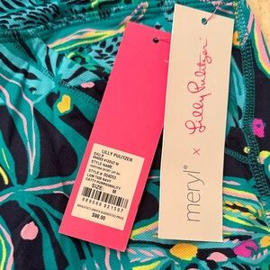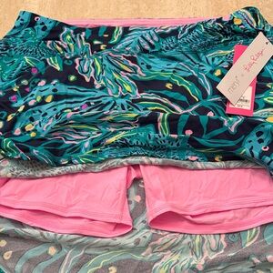 This Lilly Pulitzer skort is vibrant in colors - shades of blue,teal, and pink. Fun print! It has pink spandex under the skirt for protection. Also the skirt is UPF 50. Brand new with tags. Women’s size M.