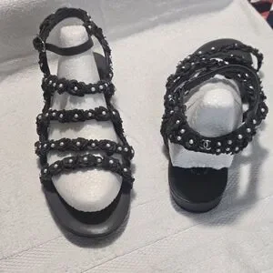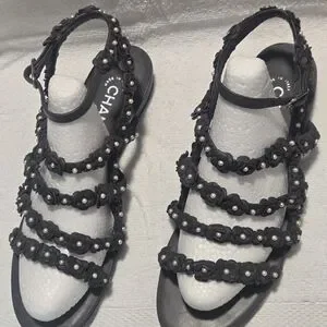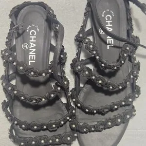 Stylish black sandals with floral accents. Strappy design for a chic look. Ideal for any occasion.
