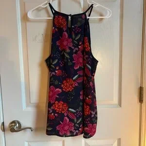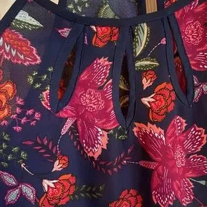 Floral print with blue, pink, green, white, red, and orange colors.