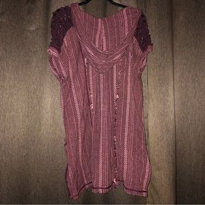 Stylish burgundy top/dress with a hood. Features short sleeves and front pockets. Perfect for casual wear.