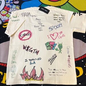 Discover the Homme + Femme "Rest Stop" Tee in Off White, a piece that captures street art’s raw and authentic spirit. Designed with hand-drawn doodles reminiscent of graffiti and tags commonly seen in rest stop or school bathrooms, this shirt offers a unique and urban-inspired aesthetic.
