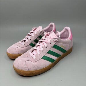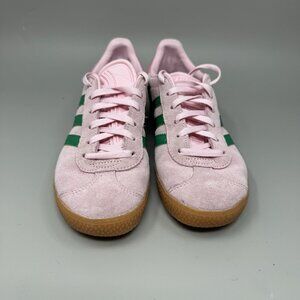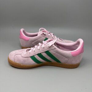 The product is a pair of Adidas J "Clear Pink Court Green" low top sneakers for kids in size 3.5. These athletic shoes feature a stylish design with a pink color and a sneaker style, making them both functional and fashionable for young children. With the reputable Adidas brand, these sneakers offer both quality and style for kids who enjoy active play and sports.