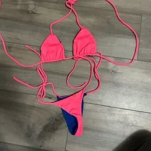 Bright and fun size xs Indah reversible bikini swim set featuring vibrant pink and blue colors. Perfect for a day at the beach or pool. Top and bottom are both size extra small. There are no tags on this bikini because it is reversible. Bought from revolve