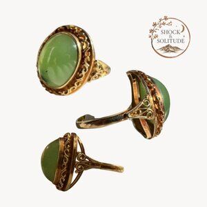 This 1950s–70s ring features ornate raised filigree, a crown-style bezel, and hand-finished scrollwork. European goldsmiths often paired real jade with 14K settings during this era, creating meaningful pieces symbolizing harmony, luck, and protection. 🌿✨
