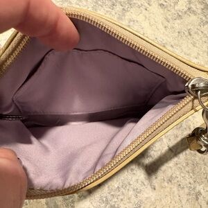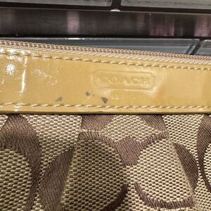 Elegant wristlet with iconic Coach pattern. Features a sleek wrist strap. Perfect for a night out when you just need the essentials.
