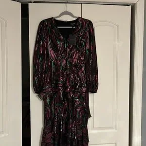 Elegant midi dress with vibrant patterns. Features long sleeves and a flattering fit. Perfect for any occasion.