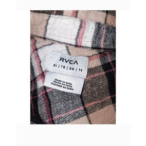 This pre-owned RVCA women's plaid button-down shirt features a beige, black, and pink color scheme. Made from 100% cotton, the long-sleeved shirt has a collar, a full button-front closure, and a single chest pocket on the left side. The tag indicates a size XL | TG | XG | 14 and states "Made in India." The fabric shows some minor signs of wear consistent with a pre-owned ite