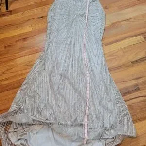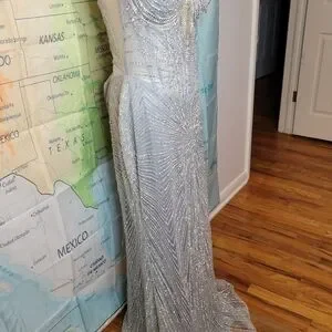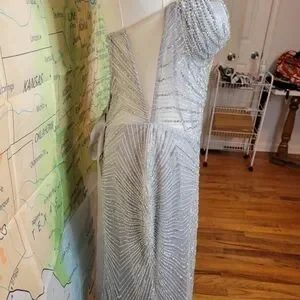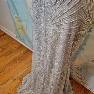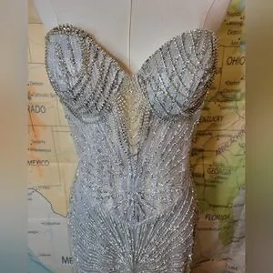 Elegant strapless dress with intricate silver beading. Perfect for special occasions like new years eve, a party, or this would make a great Halloween costume. Ice queen or mermaid, it's beautiful.