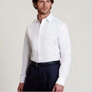 Brand new with tags. A crisp, modern essential from Banana Republic, this tailored slim fit white poplin dress shirt is cut from smooth 100% cotton and finished with refined details throughout. The clean button-down collar, long sleeves with polished button cuffs, and sharp silhouette make it a reliable choice for work, events, or everyday elevated style. Men’s size Large. Made in Turkey.
