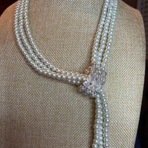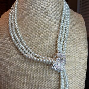 Elegant Pearl Necklace with Rhinestone, crystals and silver Silver Accents