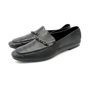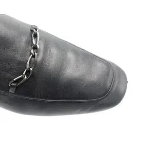 Black leather upper, squared toe, polished chain detail