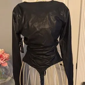 Elegant black bodysuit with long sleeves. Ideal for a stylish ensemble.