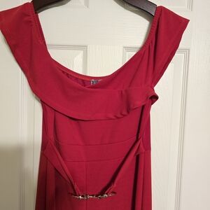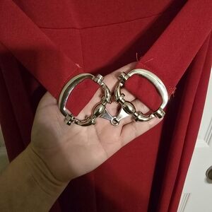 Stylish red jumpsuit with elegant silver ring details. Perfect for a chic look.