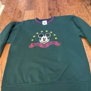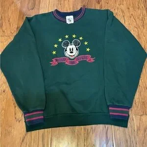 Authentic 90s Mickey & Co sweatshirt in forest green featuring embroidered/appliqué Mickey Mouse with star circle. Classic retro striped cuffs + neckline.