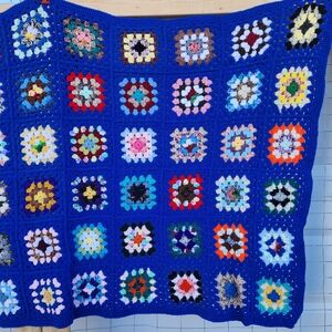 Handmade Granny Square Crochet Afghan Blanket Blue Trim 60"×38" Roseanne Style