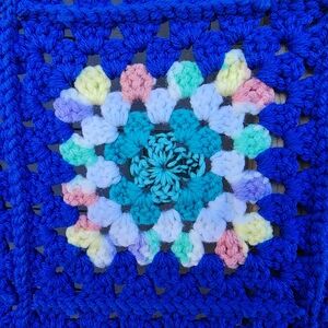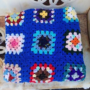 Cozy up with this vibrant handmade crochet blanket. Featuring a stunning array of colors on a blue base, this blanket adds a pop of color to any room.