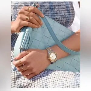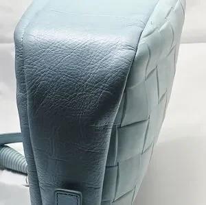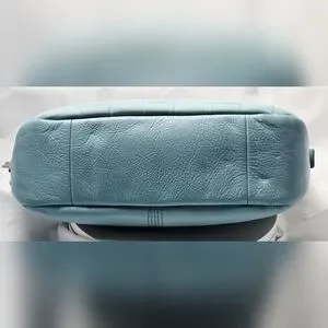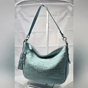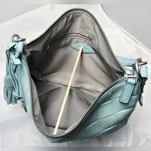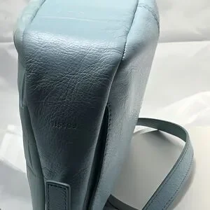 This is such a gorgeous and soft leather purse by Fossil. 🤩 It is a light turquoise blue leather with a soft faux woven leather embossed front. The bag has a shoulder strap and two charms: one is a woven leather tassel charm, and the other is a silver Fossil key.