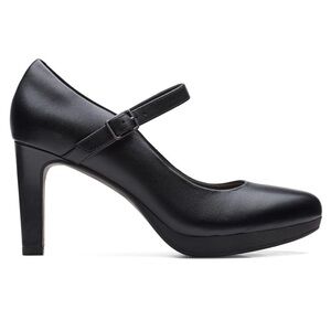 Clarks Ambry Black Heel Mary Jane with Strap. Elegant and versatile black Mary Jane shoes perfect for any occasion. Features a classic buckle strap for a secure fit. Great Pre Owned Condition.