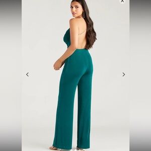 Edge up your closet with this perfect cowl neck jumpsuit! The jumpsuit features a sleeveless neckline, detachable chain straps that cross along the sexy open back, and a flattering wide-leg silhouette on stretchy knit-lined fabric. Worn 1x as pictured- gold belt chain added and will be included with purchase as a free gift!