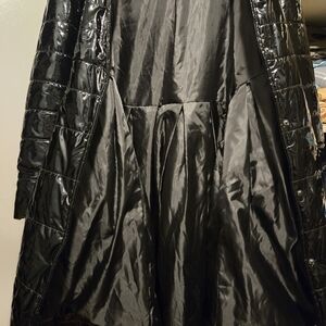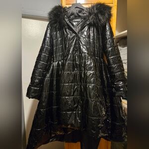 Shiny black puffer with dramatic faux fur collar. Elegant and warm for winter days.