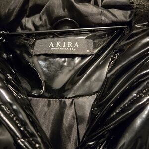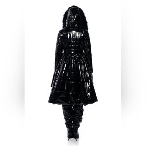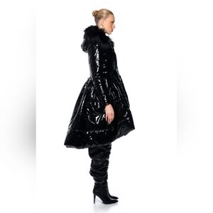 AKIRA Glossy Black Peplum Puffer Coat with Faux Fur
