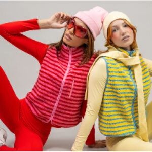Cozy fleece vest with yellow and blue stripes. Features a front zipper and high collar. Never worn!