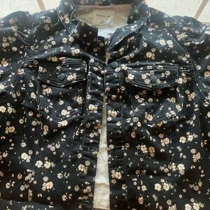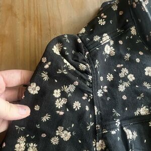 Stylish black denim jacket with floral pattern, point collar and puff sleeves. Features button closure and chest pockets. Lightweight and ideal for casual outings. Pre-loved and little to no imperfections.