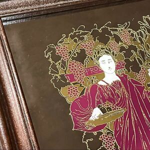Gorgeous vintage framed mirror graphic. Two Grecian ladies with grapes and foliage welcome you to “The Wine Cellar.” Dark walnut tone frame. Gold & burgundy graphic. Measures approximately 14.5”x 14.5”. Vintage so mirror background has some imperfections, as does frame. See pics. Adds character and does not detract from aesthetic. Photos are a part of the description. Color may vary with lighting or device.