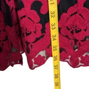 Evoke timeless elegance with this tunic dress, where sheer black mesh sleeves meet exquisite red floral embroidery. Designed by Niza, it offers a sophisticated charm through its intricate details, including pleated accents on the neckline and a flowy silhouette. Ideal for an effortlessly chic style statement. Perfect for that special or holiday event.