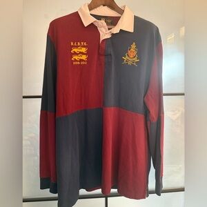 Bold color block design. Features embroidered crest. Perfect for casual wear.please note there is a small hole on the side at the bottom of the hem.