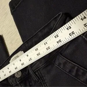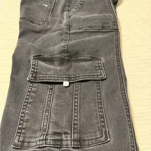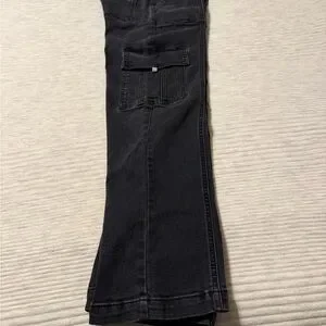 Stylish black cargo pants with multiple pockets. Straight leg. Designed with some fading for style. Measurements in photos.