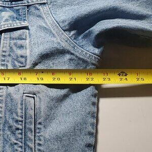 jacket is missing size/content tag - based on comparisons on ebay this is a size small - pit to pit is 22.5 inches and bottom of jacket narrows down to 18 inches flat across - see all pics for measurements - denim is 100% cotton and weighs 2lbs4ozs - small spot on breast pocket flap (circled in blue in last pic) - as well as rip/distressing in denim by 2nd button hole- I have patched this with light denim patch since fabric was weakened - patch stitching is along existing seams and patch is fabric bonded to jacket and is permanent/washable - pictures of jacket inside-out as well as pic 6 shows denim patch - some fading from regular wear on color - embroidery on back size is about 10 inches by 7 inches -